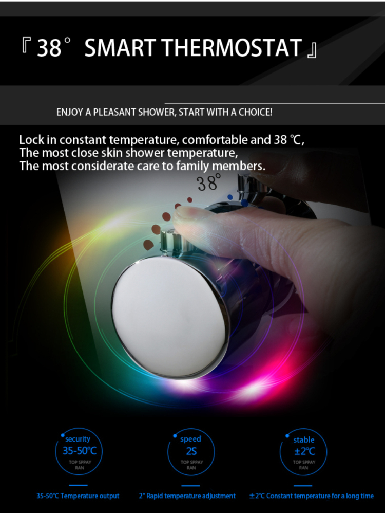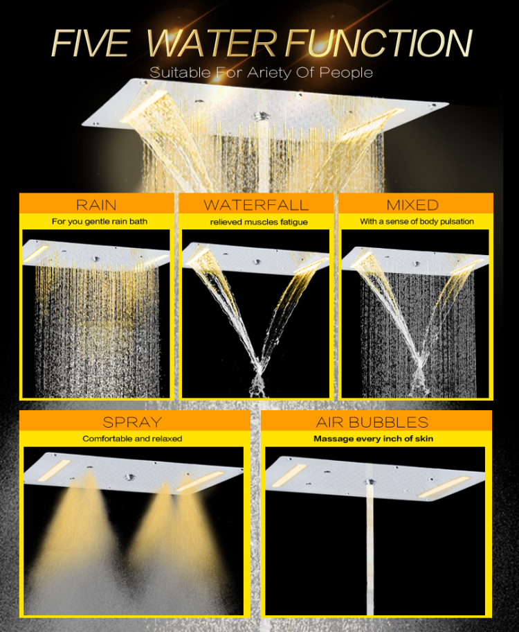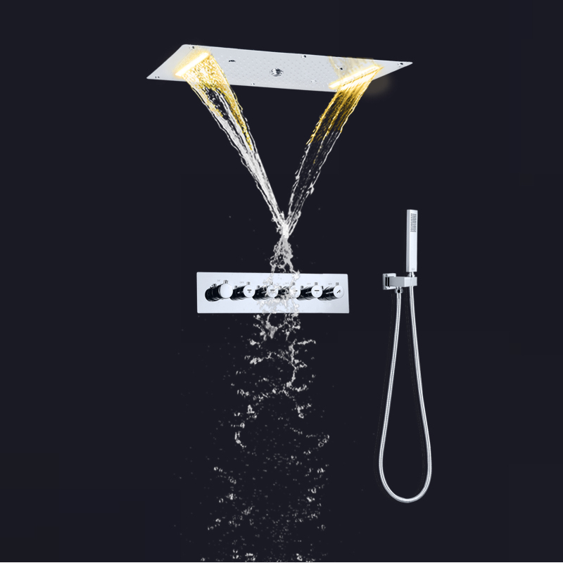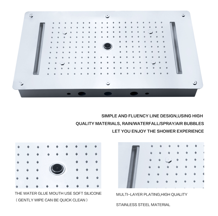 Lar / Produtos / 700X380MM SUS 304 Montado no Teto SPA Banheiro LED Névoa Termostática Spray Cachoeira Chuvas Conjunto de Cabeça de Chuveiro